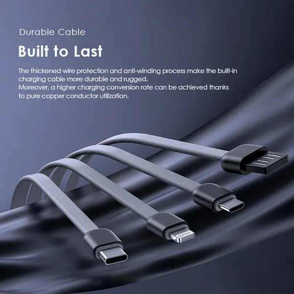 Traveler Link 20 is equipped with 3 built-in charging cables and 1 USB-A port, Traveler Link 20 can simultaneously deliver power to 4 devices at a speed of up to 12W.